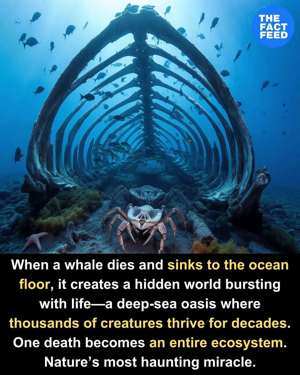 Far beneath the shimmering waves, in the silent darkness of the deep ocean, one of natureโs most hauntingly beautiful miracles unfolds โ a phenomenon known as a โwhale fall.โ ๐๐ When a massive whale dies and its body sinks to the ocean floor, it becomes the foundation of an entire underwater ecosystem โ a deep-sea oasis where life flourishes for decades. ๐โจ