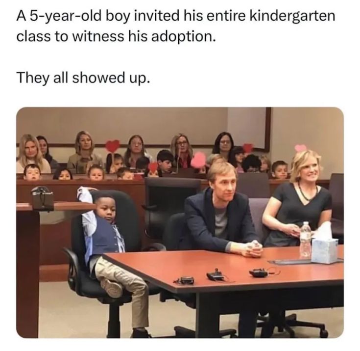 In a Michigan courtroom, a 5-year-old boy sat proudly beside his soon-to-be parents as a judge finalized his adoption. What made the day extraordinary was who filled the audience: his entire kindergarten class. Each classmate came to witness the life-changing moment, waving paper hearts and cheering for their friend. ๐โจ