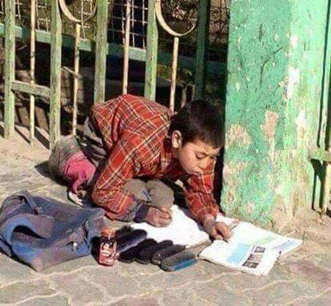 In the corner of a busy street, a young boy kneels on cold pavement, bent over his schoolbook with complete focus. Beside him lies a small bag of shoe polish and brushes—tools of his daily work. Between shining shoes for a living and studying in stolen moments, he is building a bridge to a better tomorrow. 🌅💪