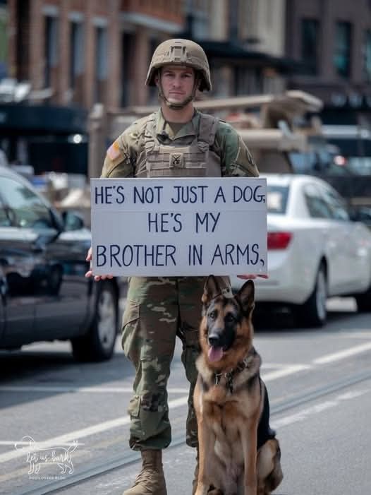 This striking photograph captures the unbreakable bond between a soldier and his loyal service dog. The soldier’s sign says it all: “He’s not just a dog, he’s my brother in arms.” 🌟