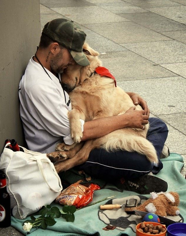 On a city sidewalk, a man sits wrapped in simple clothes, his belongings gathered in a small bag. In his lap rests his golden companion, nestled close, eyes closed in perfect trust. They hold each other as if the world beyond them doesn’t exist. 🌿✨