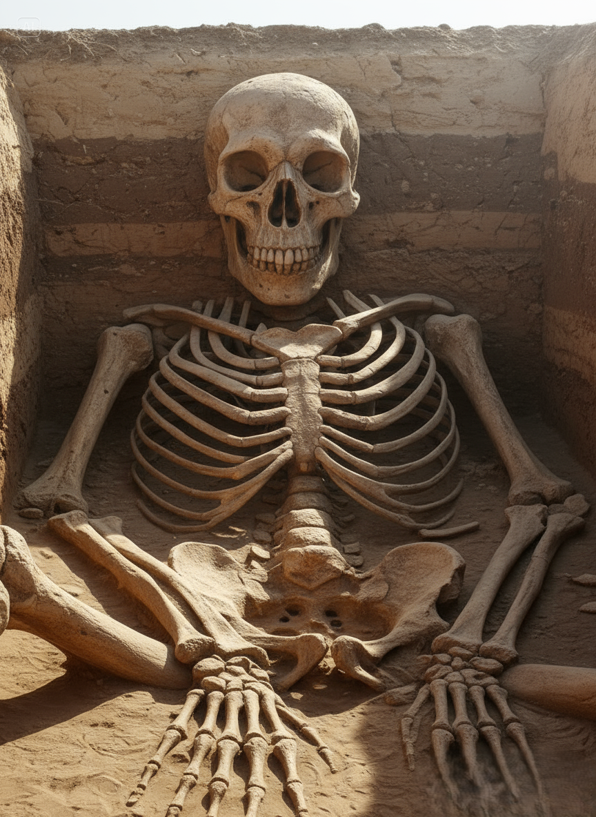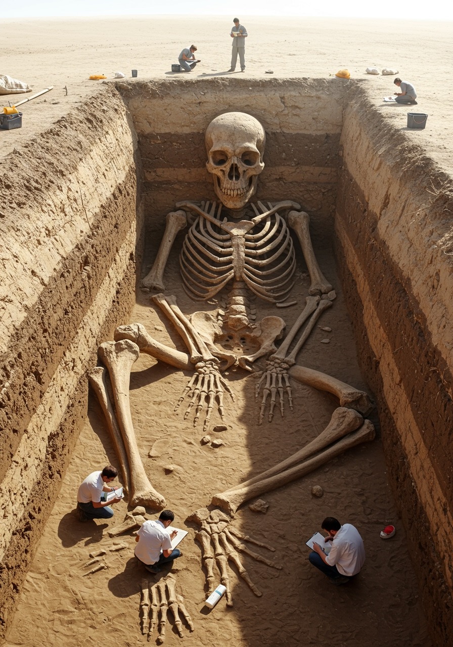 In the blazing expanse of an isolated desert, archaeologists have uncovered a skeleton so massive it has shaken the scientific community and stunned the world. Excavation footage reveals colossal bones emerging from the sands, their sheer scale dwarfing the researchers working tirelessly under the sun. The humanoid proportions—towering femurs, immense rib cages, and a skull of unimaginable size—defy conventional evolutionary timelines, raising a chilling question: who, or what, walked this Earth before us? Already, the discovery has ignited feverish debate: some experts argue this could be evidence of an unknown branch of humanity, while others insist it is proof that the “giants” of myth and scripture were more than allegory. The haunting image of the skeleton surrounded by tents, cameras, and high-tech equipment feels less like routine archaeology and more like a moment ripped from legend.