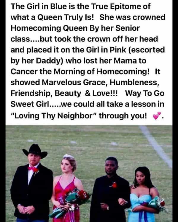 The young woman in blue was crowned Homecoming Queen by her senior class. But when she learned that her classmate in pink had lost her mother to cancer that very morning, she performed an act of breathtaking kindness: she took off her own crown and placed it on her grieving friendโs head. ๐ธโจ
