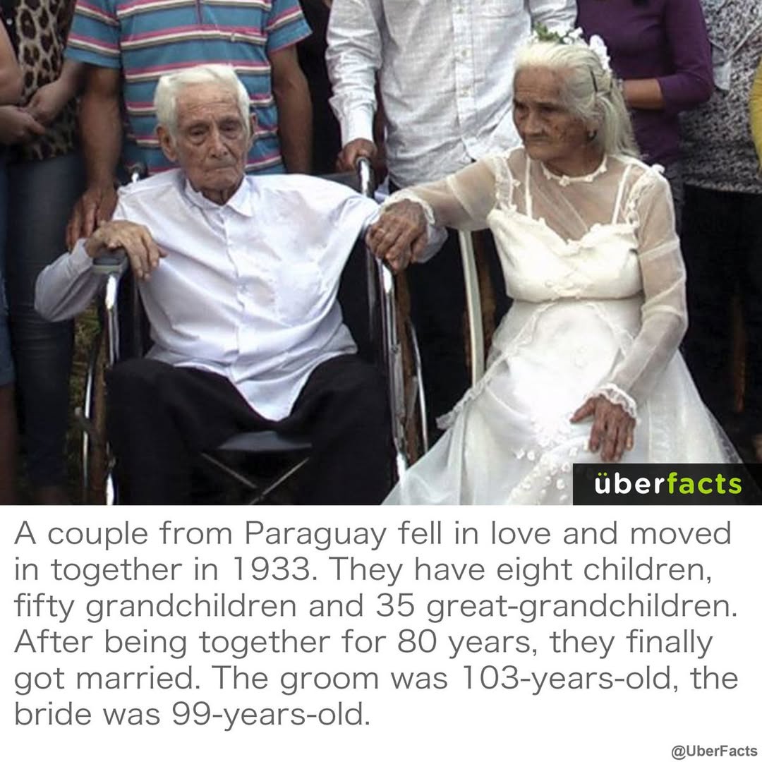 This beautiful couple from Paraguay began their life together in 1933. Over the decades, they built a family of eight children, fifty grandchildren, and thirty-five great-grandchildren. After 80 incredible years together, they finally decided to make it official.