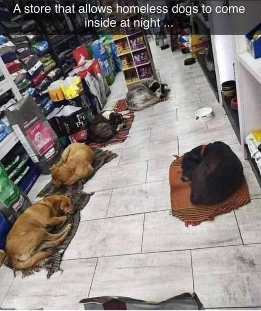 Every night, when the doors close to customers, the owner opens them for homeless dogs. Soft blankets are carefully laid on the floor, fresh water bowls are placed nearby, and the shopโs warm lights create a peaceful shelter where these gentle souls can finally rest. ๐ ๐