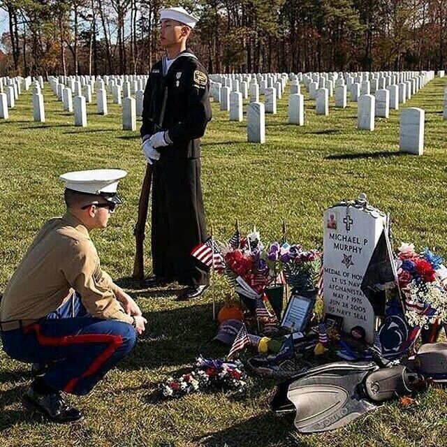 Under a sky of quiet honor, two servicemen—one kneeling in reflection, the other standing guard—pay their respects at the headstone of Michael P. Murphy, a U.S. Navy SEAL who gave everything for his country. His grave is lovingly covered with flags, flowers, medals, and tokens of gratitude, each one a silent thank-you for his ultimate sacrifice.