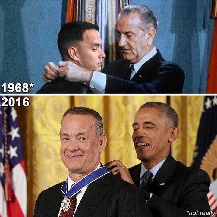But there’s more here than meets the eye. The top image isn’t from a real medal ceremony at all—it’s a scene from the beloved film Forrest Gump, where a fictional character is awarded for heroism during the Vietnam War. The bottom photo, however, is completely real: a celebrated actor truly receiving the Presidential Medal of Freedom for his lifelong contribution to art and culture. By placing the two moments side by side, this creative composition gently blurs the line between cinematic legend and lived achievement. 🎬➡️🏛️