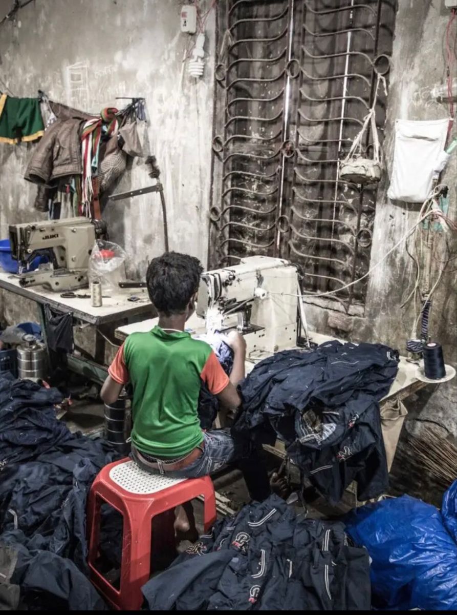 In this stark and heartbreaking photograph, a young boy sits on a plastic stool, bent over an old sewing machine in a dimly lit room. Around him lie piles of clothes waiting to be stitched, while cracked walls and tangled wires reveal the harshness of his daily reality. There are no toys, no classrooms, no carefree afternoonsโonly endless hours of labor.