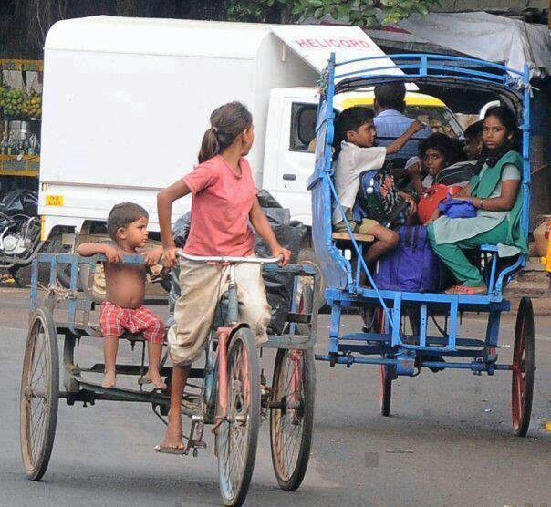 In this striking street photograph, a young girl pedals a heavy tricycle cart with quiet determination while a toddler, perhaps her little brother, clings to the side. Beside them, a blue rickshaw carries other children to school. Two worlds cross in a single frame: one of responsibility far beyond age, the other of routine childhood.