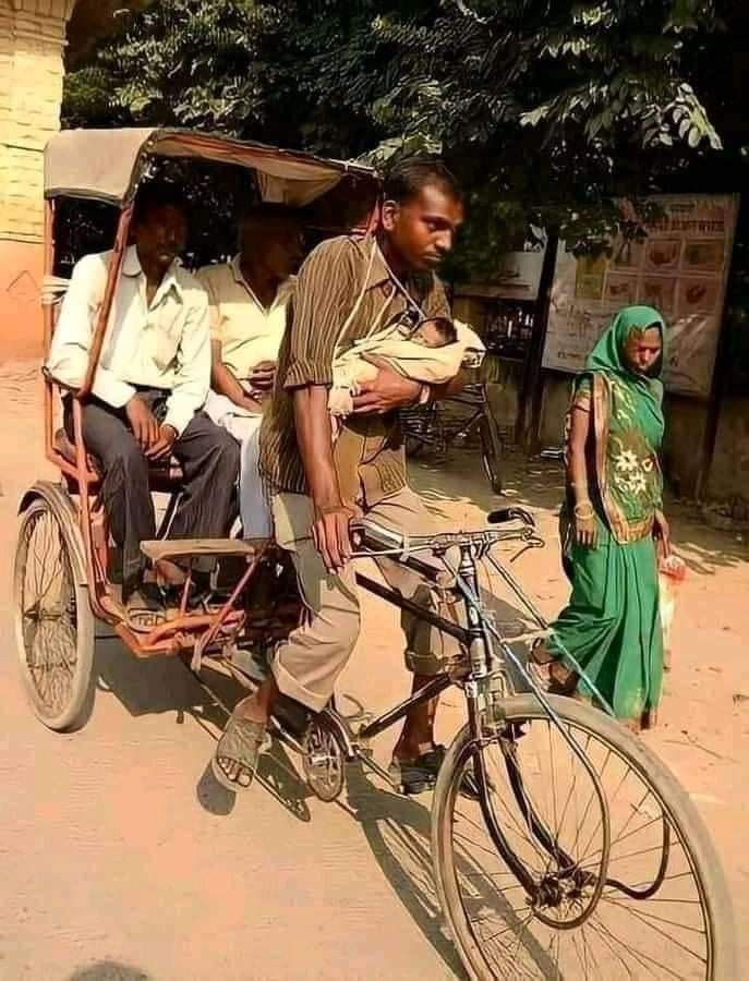 In this powerful and deeply human photograph, a man pedals a rickshaw under the bright sun, one arm steering and the other cradling a tiny baby against his chest. Behind him sit passengers waiting to reach their destinations, but his most precious cargo is the small life he keeps close to his heart.