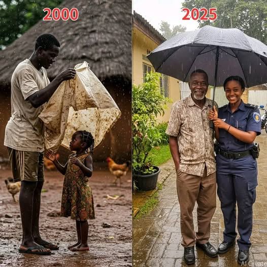 On the right (2025): The scene is reversed. Now the daughter, proudly dressed in a crisp police uniform, stands tall beside her aging father. Under one large umbrella she holds him close, smiling as she keeps him dry. Years of sacrifice and care have come full circle. 🌿