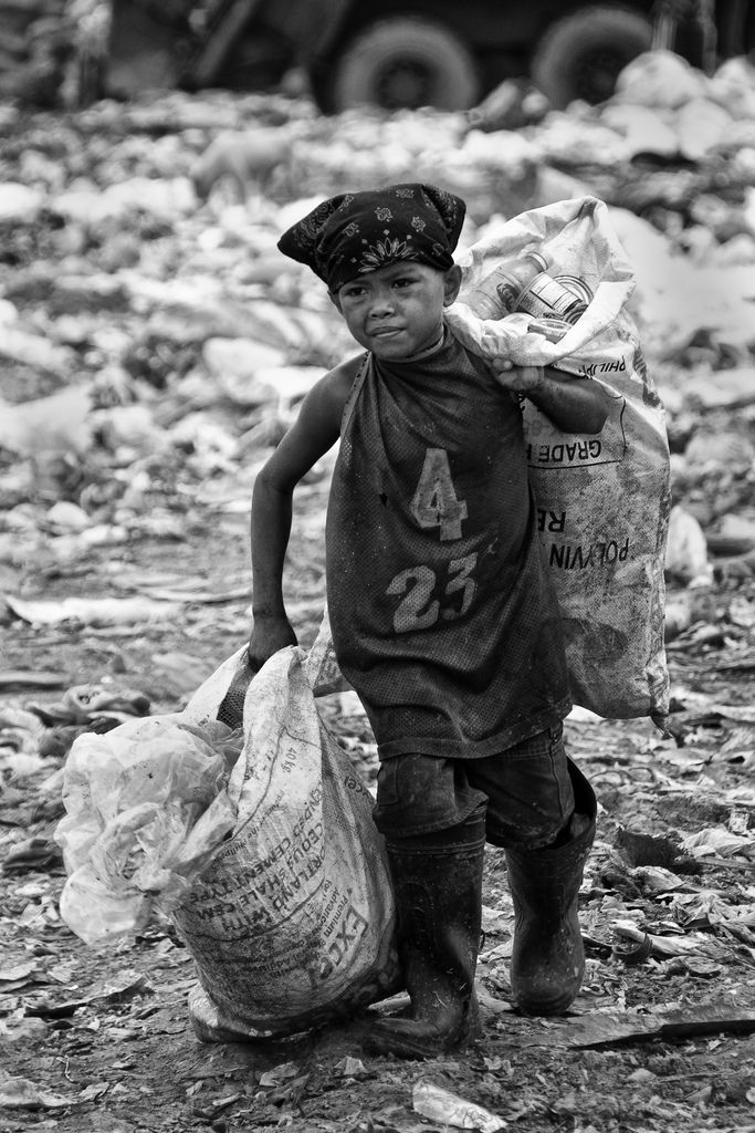 Instead of playgrounds and classrooms, this childโs days are spent sorting through garbage to earn a few coins. Each sack represents hours of labor under dangerous and unsanitary conditions. The dignity of work is there, but so is a tragedy: innocence traded for survival.