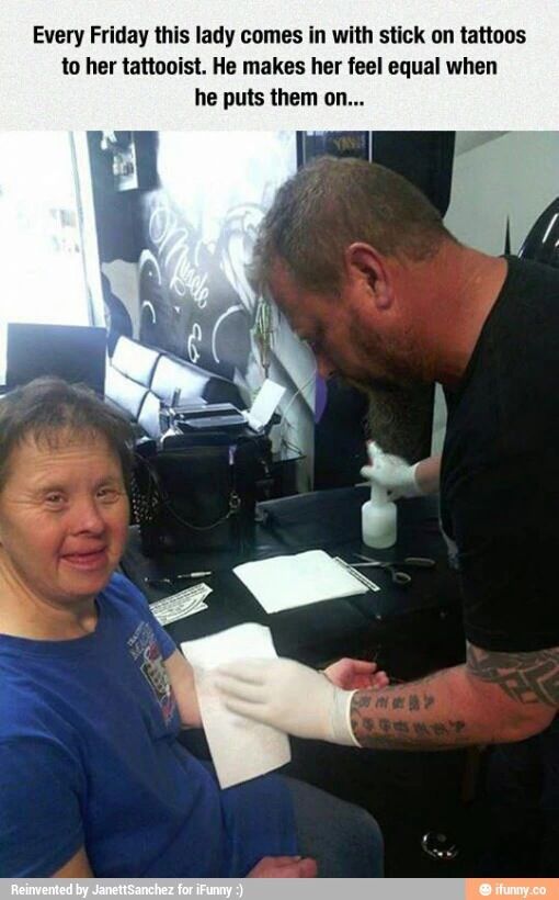 โEvery Friday this lady comes in with stick-on tattoos to her tattooist. He makes her feel equal when he puts them on.โ