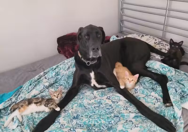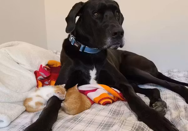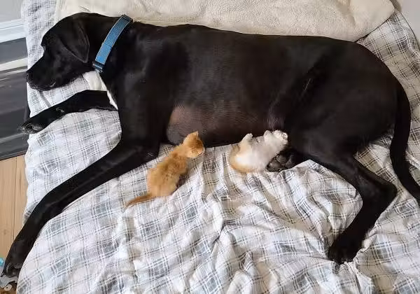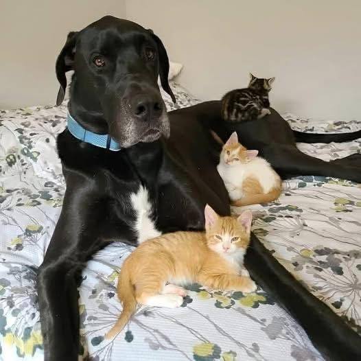 Since that day, the kittens have never left his side. They sleep curled up against his fur, climb playfully on his back, and tug at his tail with joy. And he watches over them patiently, like a gentle giant guarding his tiny family. Once considered unwanted—too old, too big, too much—he has now become a hero and a father to the most unexpected little lives.