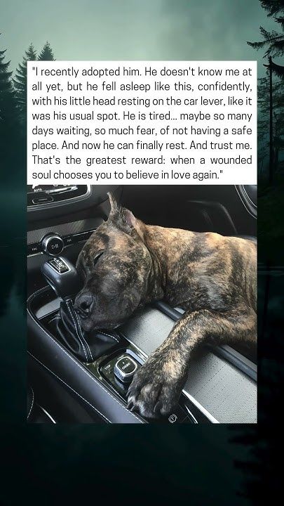 Sometimes the most beautiful love stories begin in the quietest moments. This heart-melting photograph captures one of those moments of pure trust and gentle healing. A recently adopted rescue dog curls up on the car’s center console, head resting softly as if it has always been his safe spot. The world outside may have been full of uncertainty and fear, but inside this car, love finally wins. 🌿💖