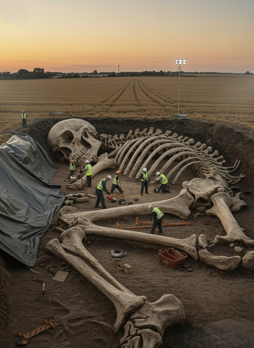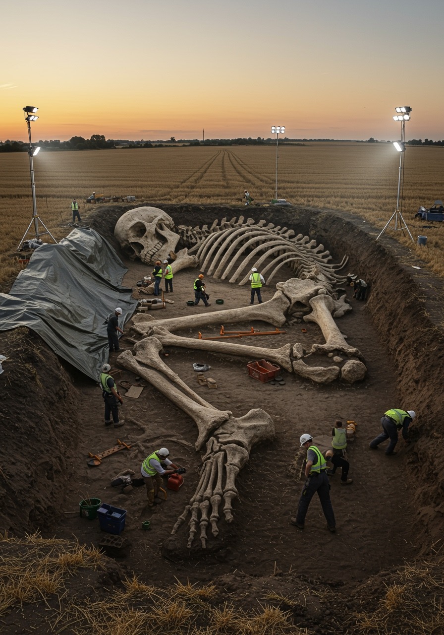A sleepy stretch of farmland has exploded into global headlines after workers and archaeologists unearthed a colossal skeleton hidden just beneath the soil. Photos from the scene show massive bones protruding from a trench, dwarfing the excavation team as they scramble to document the find. With long femurs, an immense ribcage, and a human-like skull of extraordinary size, the remains have instantly become a flashpoint for debate—are we looking at the long-whispered “race of giants” from myths, scriptures, and forbidden chronicles, or an oversized but explainable fossil misinterpreted in the frenzy of discovery?