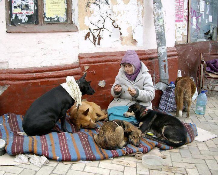 On a worn striped blanket spread across a chilly sidewalk, a woman sits quietly in the heart of the city. Her coat is well-worn, her scarf pulled close against the cold, yet her gentle eyes are full of warmth. Around her lie five faithful dogs—each one resting peacefully, trusting completely. One leans its head on her knee, another curls up in perfect contentment, while a tall black dog sits watchfully with a piece of rope draped like a scarf. In front of her, a simple meal rests in her hands, but her first thought is not for herself. Each small piece of bread is shared with care, every crumb offered as a gift of love. 🥖💞