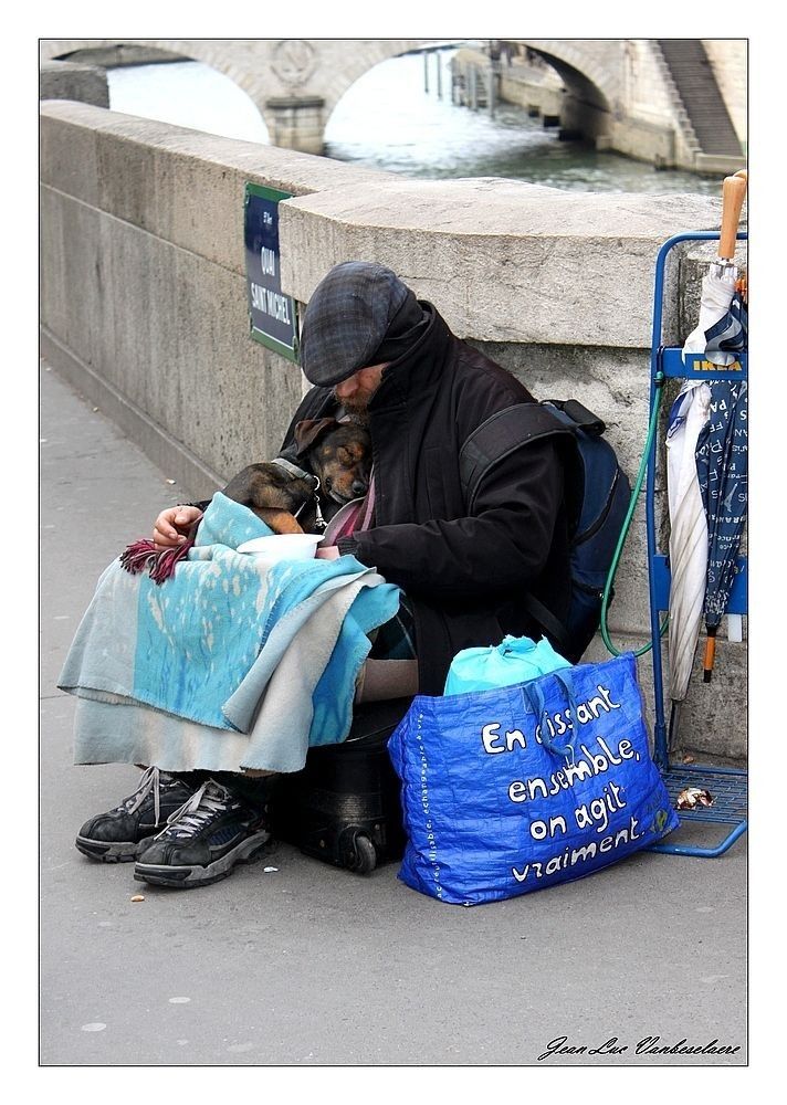 On a cool Paris morning, along the historic Quai Saint-Michel, a man sits quietly against the stone wall by the river. His belongings fit inside a single blue bag printed with the words “En tissant ensemble, on agit vraiment” — “By weaving together, we truly act.” Wrapped in a simple blanket, he holds his loyal dog close, their heads gently touching. The world rushes past—tourists crossing the bridge, the river flowing steady—but here time seems to pause. 🌊✨