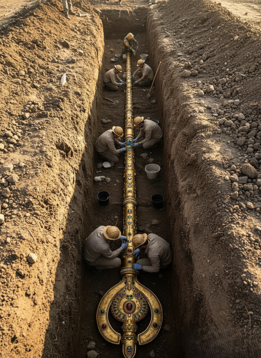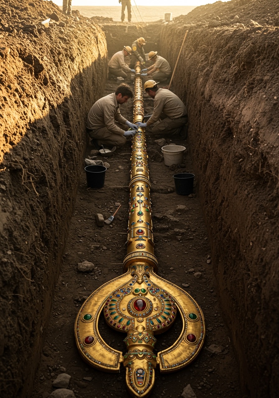 Archaeologists working in a remote desert excavation have uncovered what appears to be a massive golden scepter inlaid with precious stones, a find that has already provoked international fascination and alarm. Measuring several meters in length and gleaming with ornate engravings, the artifact was carefully extracted from deep layers of sand, with teams documenting every detail under heavy media scrutiny. Proponents of the discovery argue that the scepter could represent a ceremonial object of immense significance, perhaps a relic of a forgotten dynasty or a symbolic weapon tied to myths of gods and giants. The sheer craftsmanship—intricate carvings that shimmer under light—suggests a degree of sophistication rarely associated with the region’s known archaeological record. For many, this object embodies the tantalizing possibility that our understanding of ancient civilizations is far from complete.