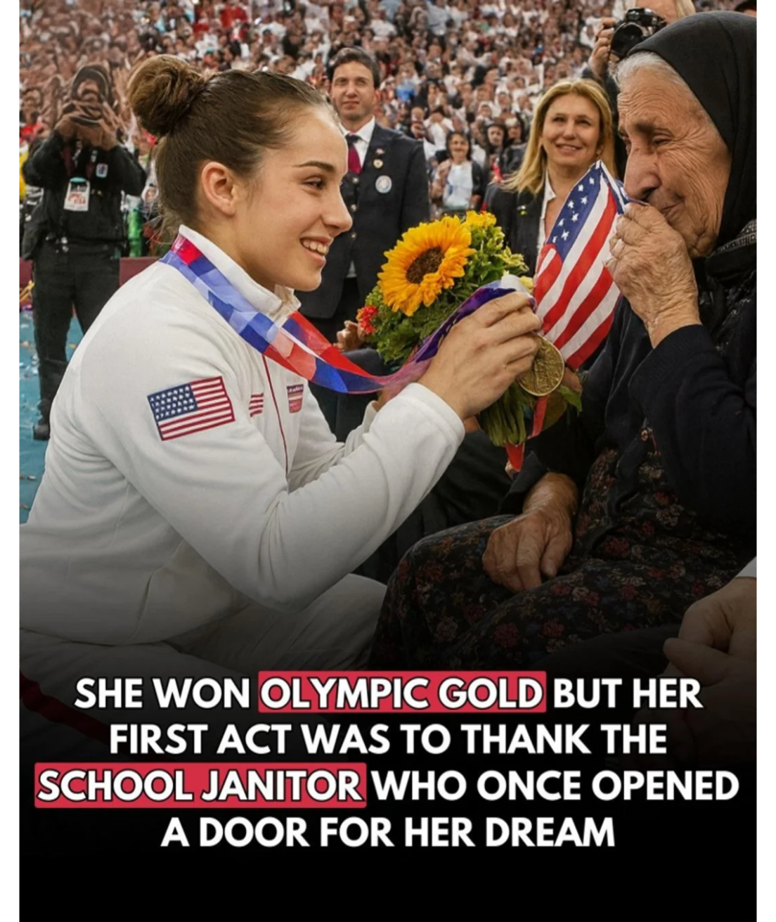 What moved me most was the memory she held onto: a janitor simply unlocking the gym door so she could keep practicing. It may have seemed like a small gesture at the time, but it changed everything. That act of kindness allowed her to keep chasing her dream—and in the end, helped her reach the highest level of success.