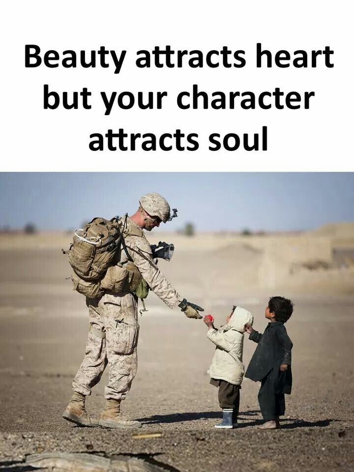 The words above the image say it best: “Beauty attracts heart, but your character attracts soul.” Outer beauty may capture attention for a moment, but it is character—compassion, humility, and generosity—that builds trust and touches lives forever. The soldier’s uniform may represent duty, but this gesture shows something deeper: a heart that sees the dignity and innocence of children even amid conflict. 🕊️💞