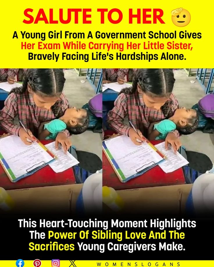 This moving photograph captures a young girl from a government school who bravely faces lifeโs challenges alone. With one arm gently cradling her sleeping sister and the other steadily writing answers, she shows a strength far beyond her years. ๐๐ง๐