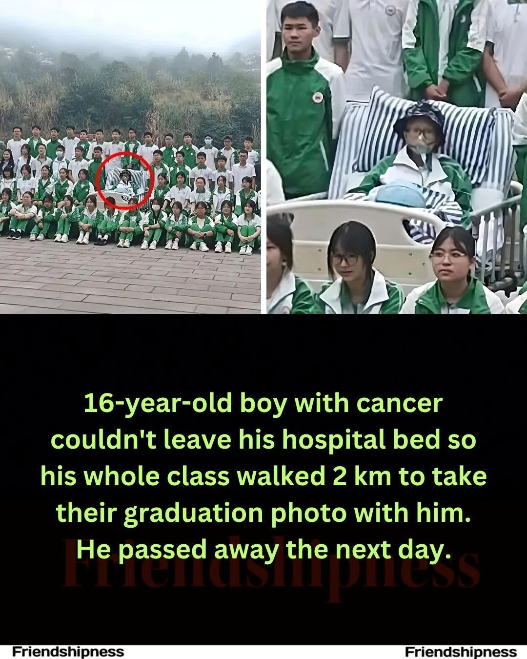 Wearing their green-and-white uniforms, every classmate walked two kilometers to gather around his bedside. Together, they posed for their graduation photo, making sure he was part of the milestone they had all dreamed of. For a few beautiful moments, laughter and memories replaced pain and hospital walls.