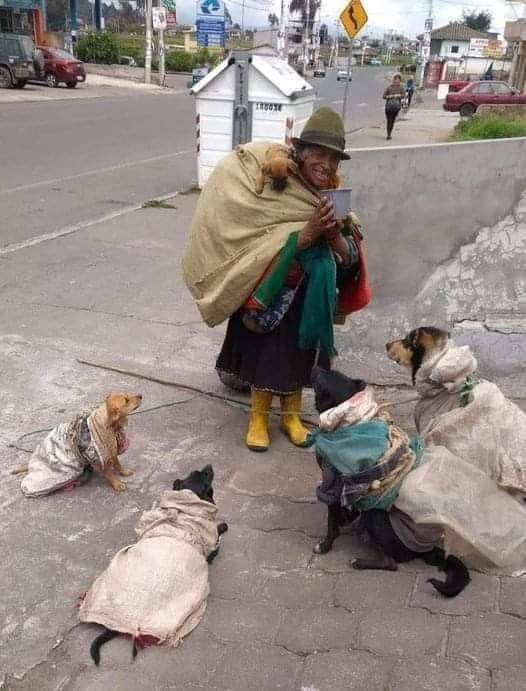 On a city sidewalk, an elderly woman stands wrapped in a warm shawl, her faithful dogs gathered around her like family. Each dog is dressed with care in little coats and blankets, proof that love is stronger than poverty. ๐ŸŒฟโœจ