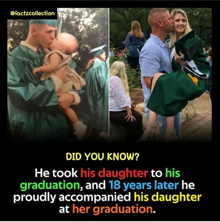 On the left, a young father proudly kisses his baby daughter while wearing his graduation gown. On the right, eighteen years later, he kisses her againโthis time as she graduates, carrying on the dream he began. ๐ฟโจ
