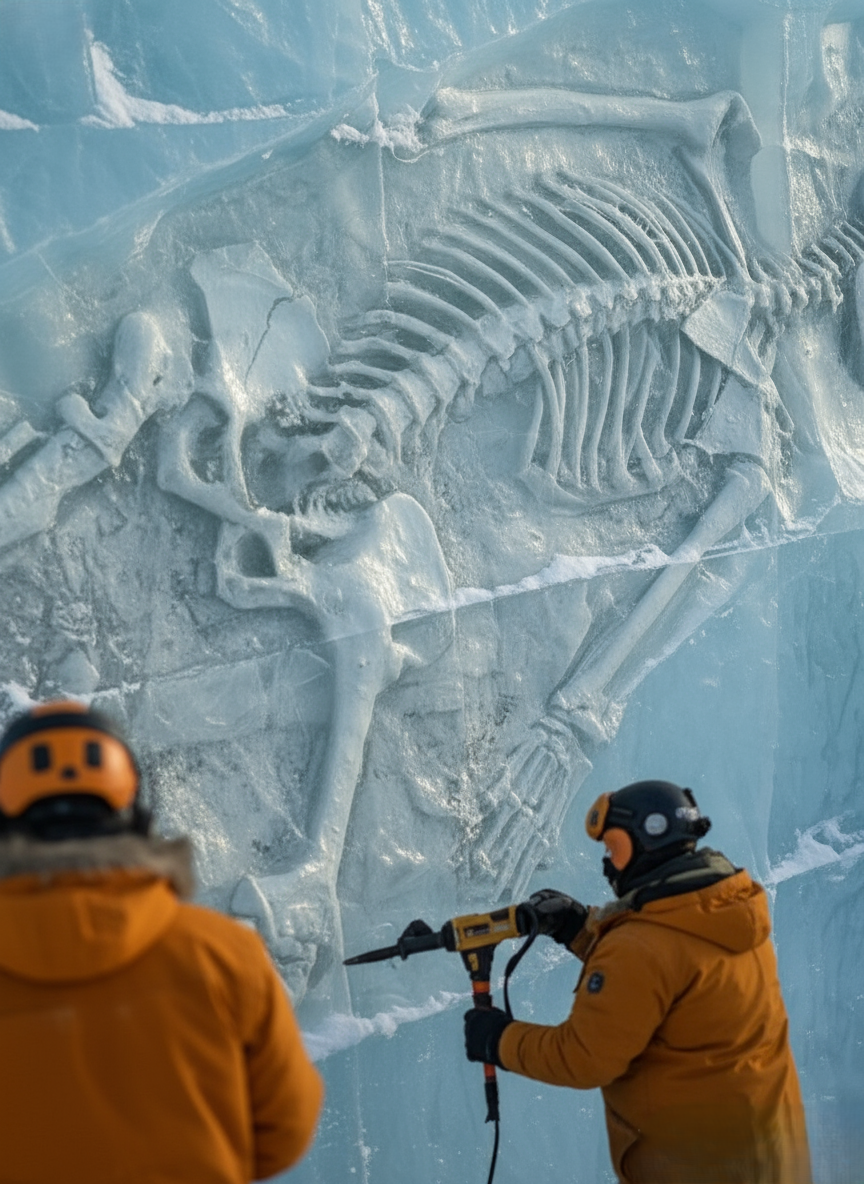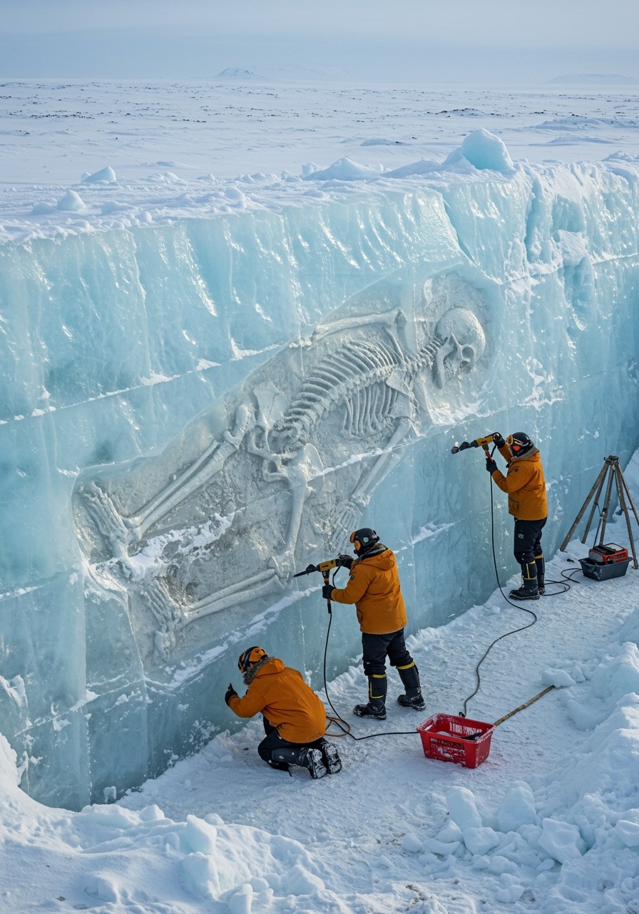 A team of researchers drilling into the frozen wilderness has uncovered what may be one of the most perplexing discoveries of modern science: a massive skeleton encased within solid ice, seemingly preserved for thousands—perhaps millions—of years. The remains, still partially embedded in the glacier, appear to display human-like proportions on an extraordinary scale, with elongated limbs and a skull far larger than any known species. Photographs and initial field reports have spread rapidly across international media, igniting a storm of speculation. For some, the discovery provides long-sought evidence of a prehistoric giant race, a subject long confined to myth and folklore. For others, it raises even stranger questions: was this being a remnant of an unknown evolutionary branch, or does it point toward mysteries that stretch beyond human understanding?