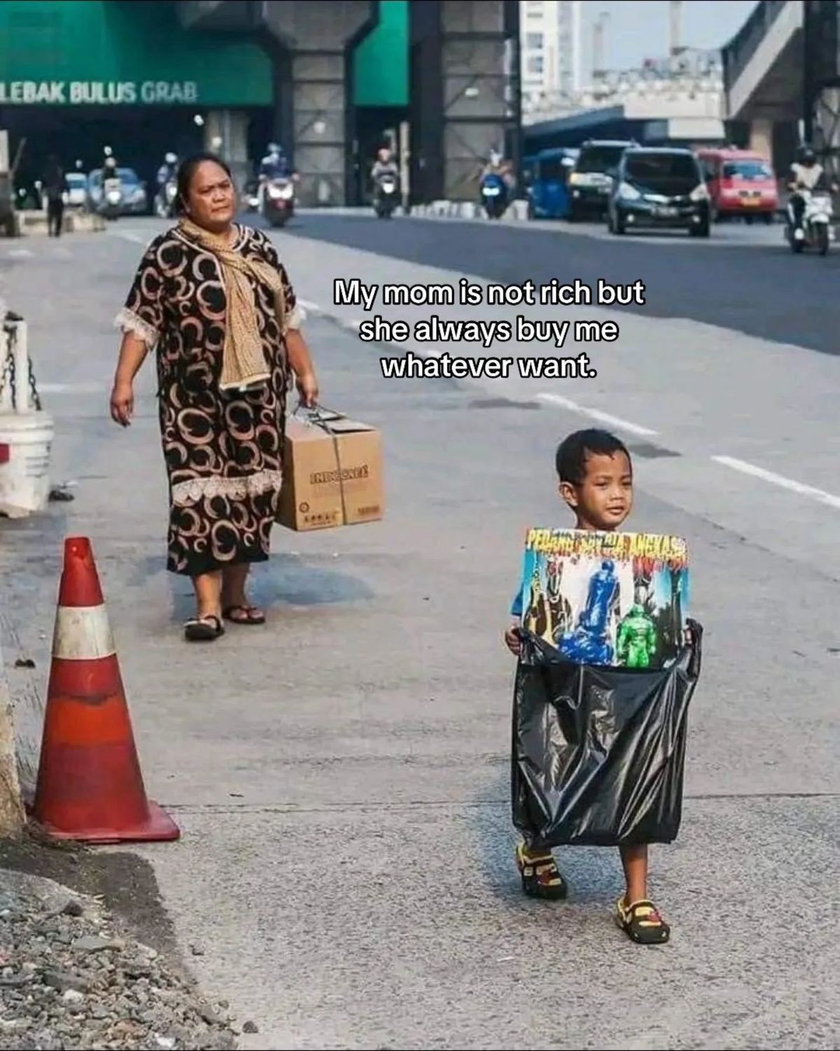The mother may not have wealth, but she has something far greater—endless love and sacrifice. Every coin she saves, every long day of work she endures, is to see a smile on her child’s face. Her tired steps and strong heart tell the story of silent struggles and selfless giving.