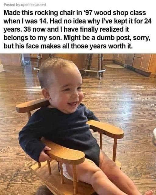 Sometimes the most beautiful gifts we give our children are the ones we never planned. Twenty-four years ago, a 14-year-old boy spent his afternoons in a high-school wood shop class, carefully sanding and shaping a tiny rocking chair. At the time, it was just a class project. He didn’t know why he felt the urge to keep it. He simply tucked it away, moving it from place to place—college dorm rooms, first apartments, new houses—each time wondering if he should let it go, yet always choosing to save it.