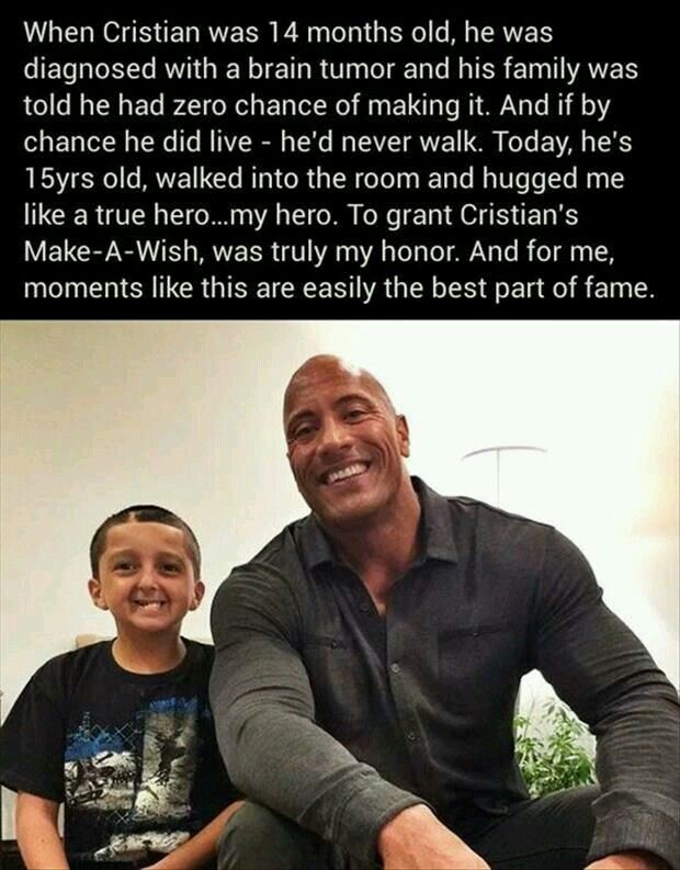 Fast forward to today: at 15 years old, Cristian walked into a room and embraced one of his heroes with a smile brighter than any spotlight. That hero—Dwayne “The Rock” Johnson—called the boy his hero instead. Through the Make-A-Wish Foundation, Dwayne granted Cristian’s wish, but he left with something far greater: the unshakable inspiration of a young man who defied impossible odds. 🌟🙌