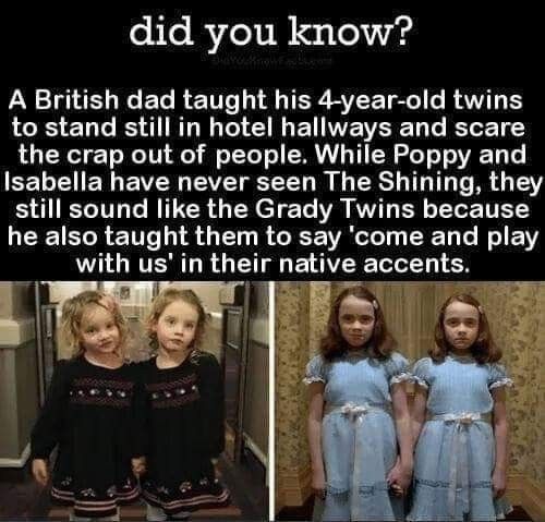 Meet Poppy and Isabella, two sweet 4-year-old twins from Britain whose dad came up with a delightfully spooky idea. Without ever watching The Shining, these little sisters learned to stand perfectly still in hotel hallways, reciting in their innocent British accents: “Come and play with us.”