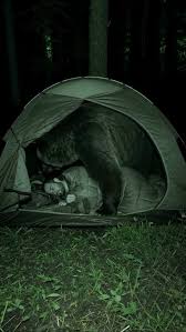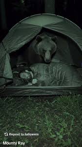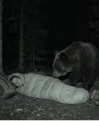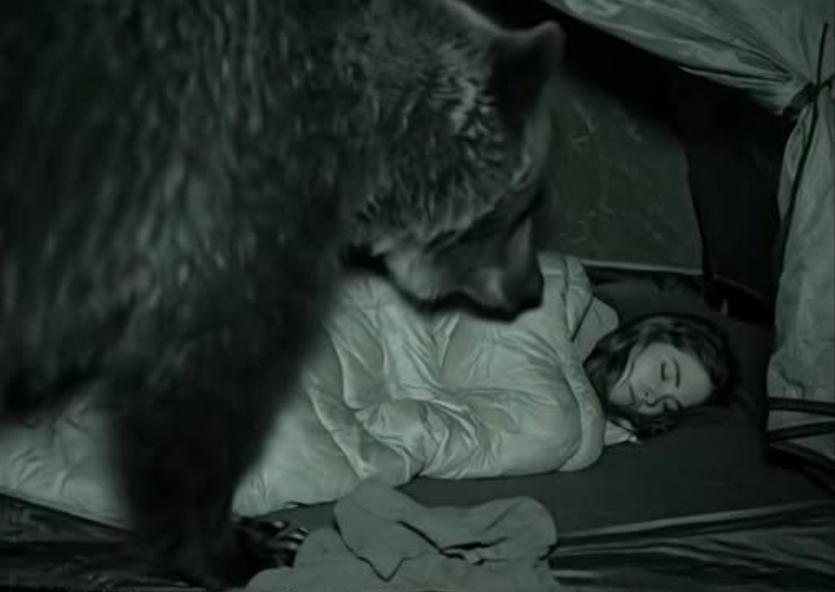 There, captured clearly on camera, was a massive wild bear—not prowling, not growling, but lying calmly beside her as she slept, just outside her tent. The bear’s posture was not aggressive, but rather peaceful, almost as if it were resting there to protect her. It was a moment that blurred the line between fear and connection. “I froze when I saw it,” she later recalled. “But it didn’t feel dangerous. It felt… connected.” The animal could have posed a serious threat, yet instead, it chose to simply exist near her in silence and stillness.
