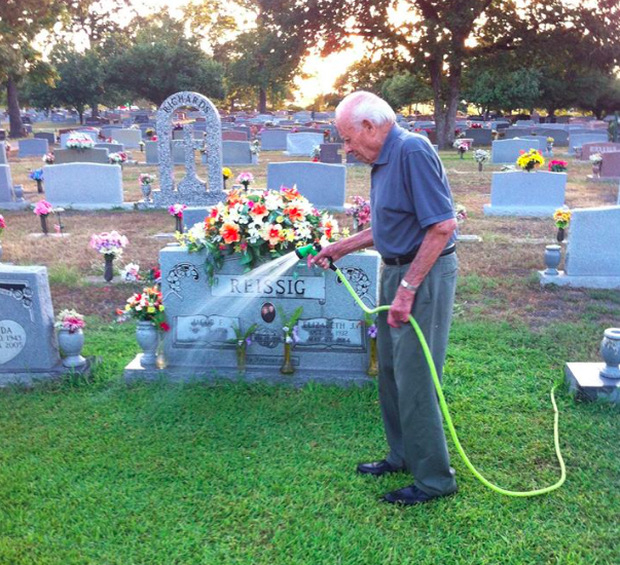 Every morning, 86-year-old Jake Reissig begins his day with a quiet ritual that speaks volumes. He walks slowly to his garden, selects a single rose, and makes his way to the cemetery where his beloved wife of 65 years rests. His steps may be slower now, but his devotion remains strong. Through sun and storm, through cracked summer earth and cold winter winds, Jake tends the patch of grass around her grave with the same gentle care he once gave her in life. His love, though now carried in memory, continues to bloom with each visit, each rose, and each moment of silent remembrance.