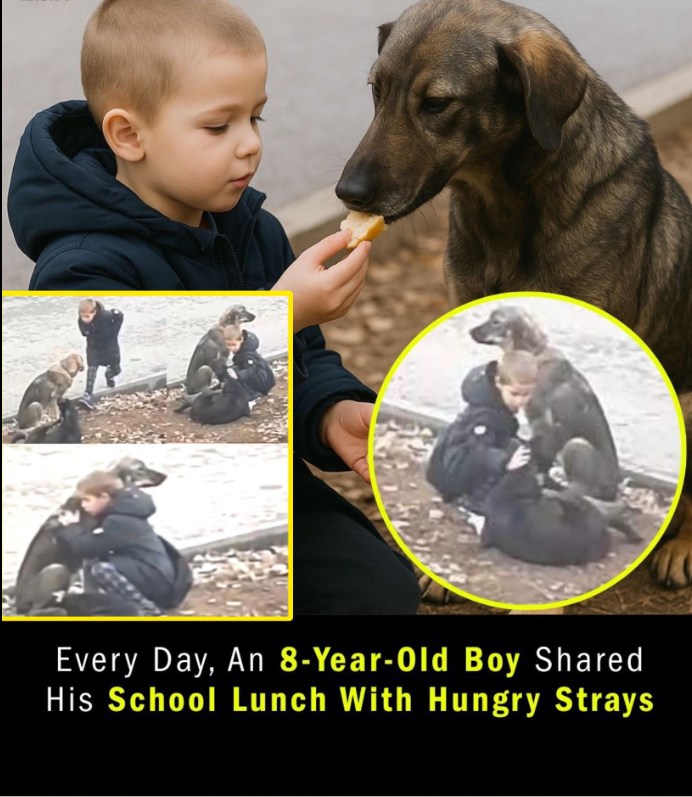 Every day after school, little Ethan returned home with an empty lunch bag. At first, his mother thought he must be eating well and finishing all his food during the day. However, her curiosity led her to check the school’s camera one afternoon, revealing a touching truth that she hadn’t expected. Near the school fence, two stray dogs patiently waited for Ethan’s arrival, their tails wagging with hope and trust. Ethan, without hesitation, would kneel down and gently share his lunch with them — giving them his sandwich, fruit, and even a few treats he had carefully saved just for them.