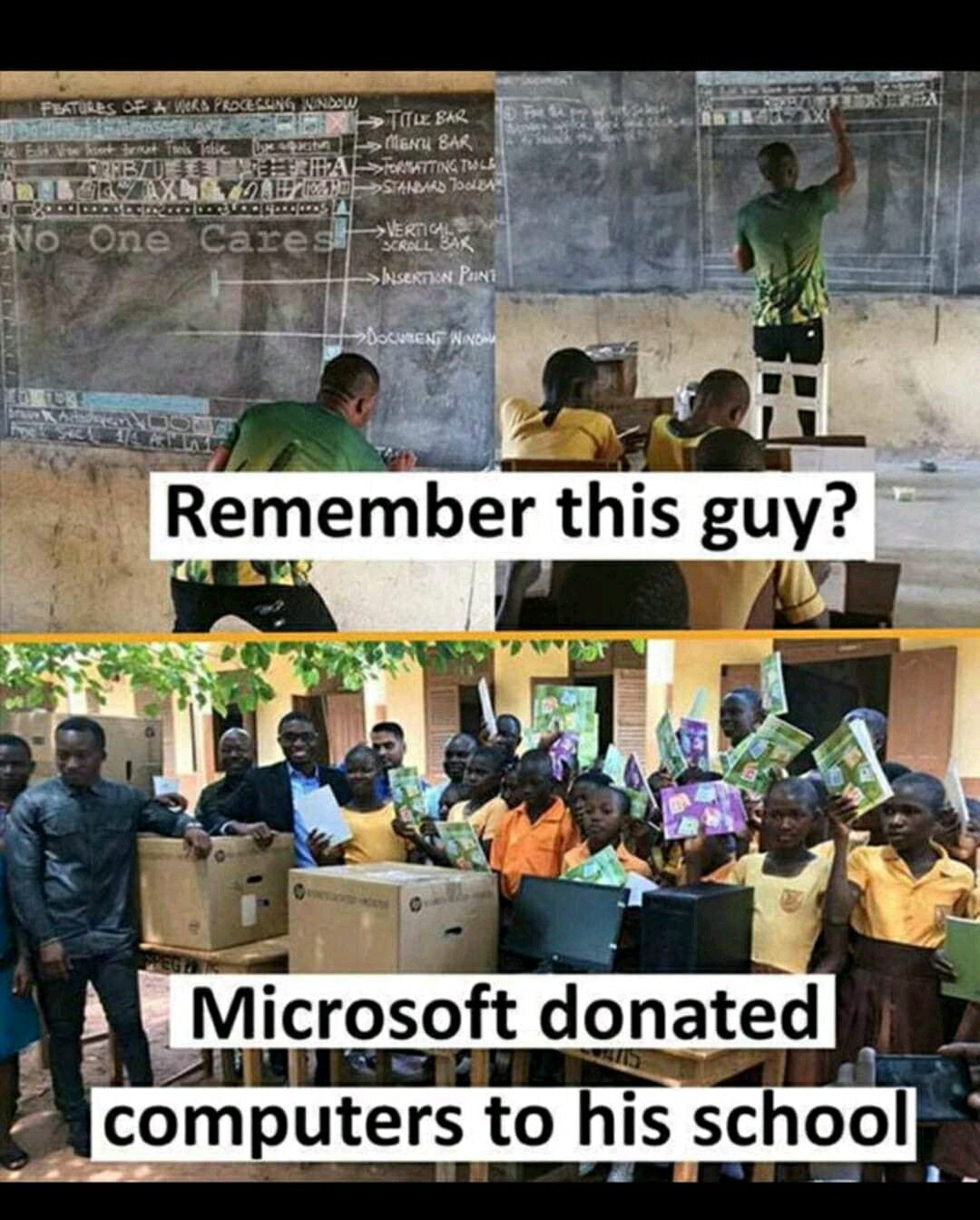 His creativity and dedication captured global attention, turning a local challenge into a worldwide inspiration. Moved by his commitment, Microsoft donated computers to his school, transforming lessons from chalk drawings into real hands-on experience. πβ¨