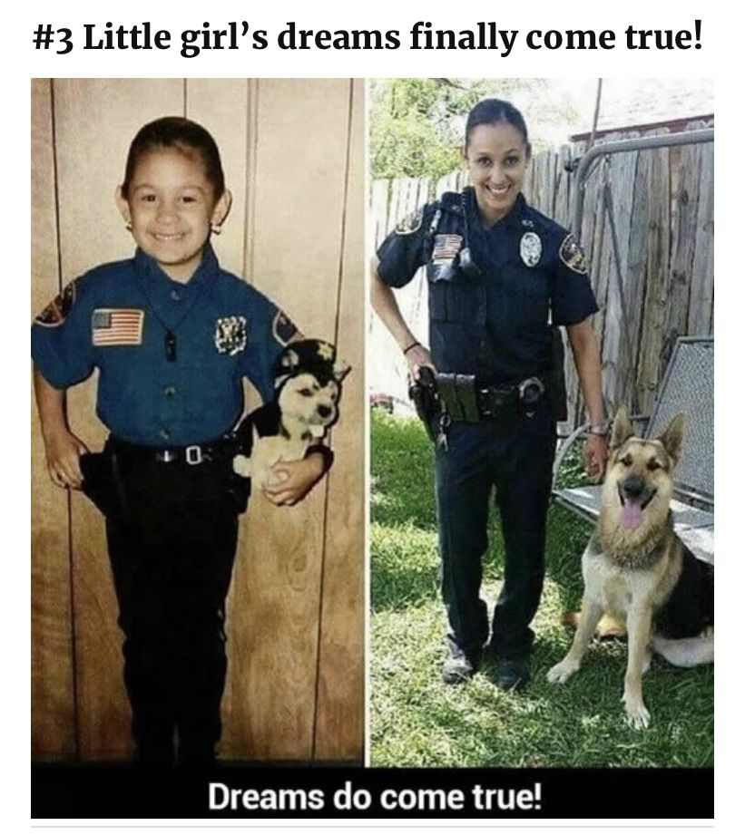 Some childhood dreams never fade—they grow stronger with time. In this heartwarming then-and-now photo, a little girl once proudly posed in a toy police uniform holding a stuffed K9 pup. Years later, she stands tall in a real police uniform beside her trained service dog, living the dream she carried in her heart all along.