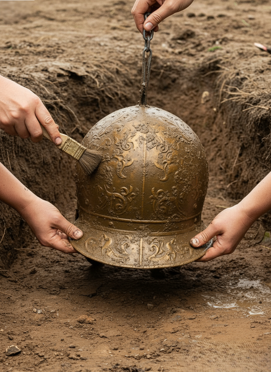 Archaeologists have announced the recovery of an extraordinary artifact from a recent excavation: a remarkably preserved warrior helmet, gleaming with metallic brilliance and adorned with intricate carvings. Unearthed from layers of soil thought to be centuries—if not millennia—old, the helmet has already been hailed as one of the most significant archaeological discoveries in recent memory. Its craftsmanship suggests a level of sophistication rarely associated with the period it is thought to represent, fueling speculation about its owner. Was it the battle gear of a powerful general, the crown-like emblem of a forgotten king, or even the relic of a mythical figure whose story has been erased from official records? For many, the helmet embodies a tantalizing bridge between legend and tangible history.
