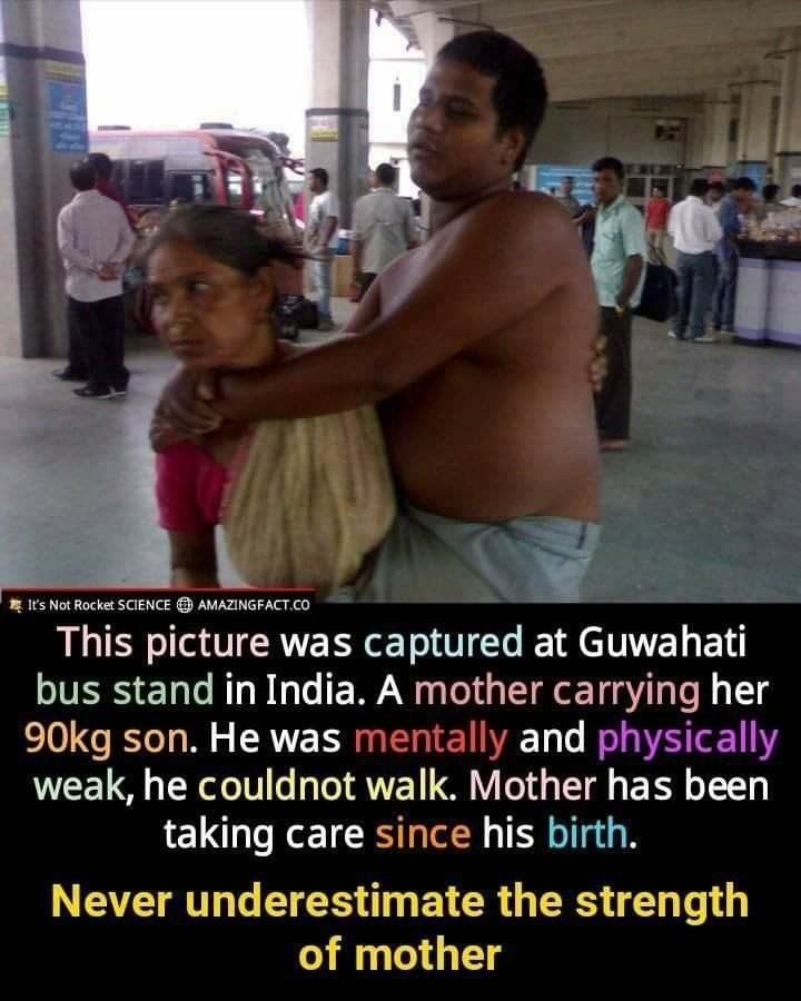 This extraordinary photograph, taken at Guwahati bus stand in India, tells a story of pure devotion and unimaginable strength. It shows a mother carrying her 90 kg son, who is unable to walk due to mental and physical challenges. She has been caring for him since birth, lifting him through lifeโ€™s every journey, literally and emotionally.