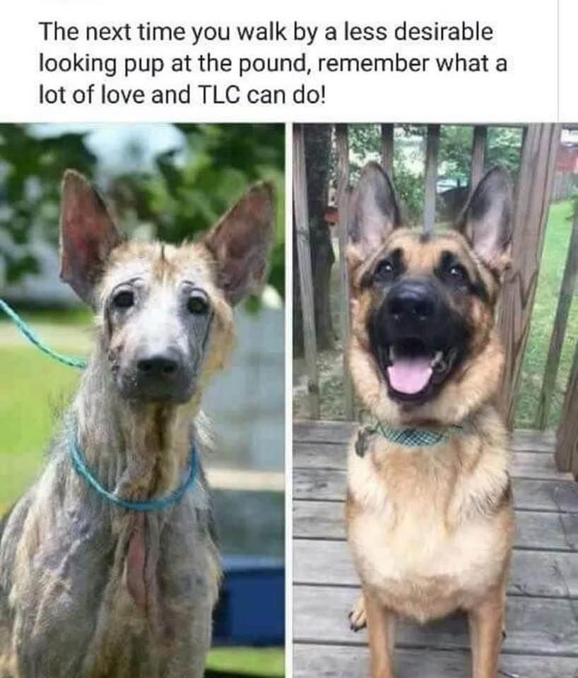 This before-and-after image is more than a feel-good moment; it’s a powerful reminder of what love and TLC (tender loving care) can accomplish. Every shelter dog, no matter how “less desirable” at first glance, carries a heart ready to give unconditional love. All it takes is someone willing to believe in them. By choosing to adopt rather than shop, you don’t just save a life—you witness the extraordinary transformation of resilience and hope. 💞🏡