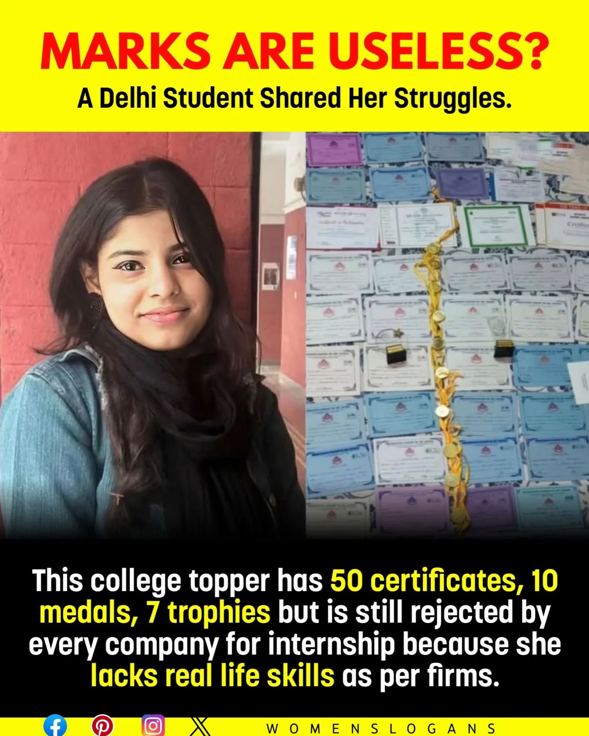 In a world that often measures success by grades and certificates, this powerful image tells a different and deeply moving story. On the left stands a determined college topper from Delhi, her face glowing with youthful ambition. Behind her, a wall proudly displays 50 certificates, 10 medals, and 7 trophies—each a symbol of hard work, sleepless nights, and relentless dedication. By traditional standards, she embodies academic excellence. Yet, despite her brilliance and accomplishments, every company she approached for internships turned her away. Why? Because they believed she lacked real-life skills—communication, adaptability, problem-solving—the very qualities that can’t be captured on paper. 📝➡️🌍