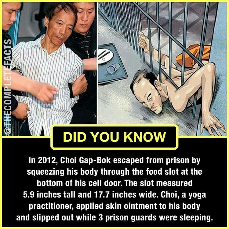 Sometimes reality is stranger than fiction, and this astonishing photograph proves it. In 2012, Choi Gap-Bok, a yoga practitioner in South Korea, carried out one of the most unbelievable prison escapes ever recorded. Locked behind bars with no obvious way out, Choi faced a cell door with only a tiny food slotβjust 5.9 inches tall and 17.7 inches wide. For most people, such an opening would be impossible. But Choi had something extraordinary: years of yoga training, unparalleled flexibility, and an unbreakable will. π§ββοΈβ¨