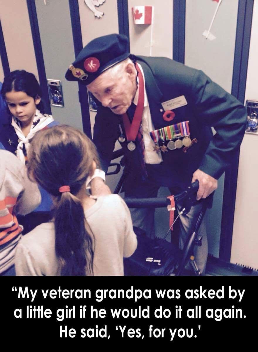 Some words are so powerful that they linger long after they are spoken. This touching photograph captures one such moment. An elderly veteran, decorated with medals of honor and wearing his uniform with quiet dignity, leans gently toward a curious young girl. Surrounded by children, he listens as she asks the question that holds the weight of history: “Would you do it all again?” Without hesitation, he smiles and answers softly, “Yes, for you.” 🌹🕊️