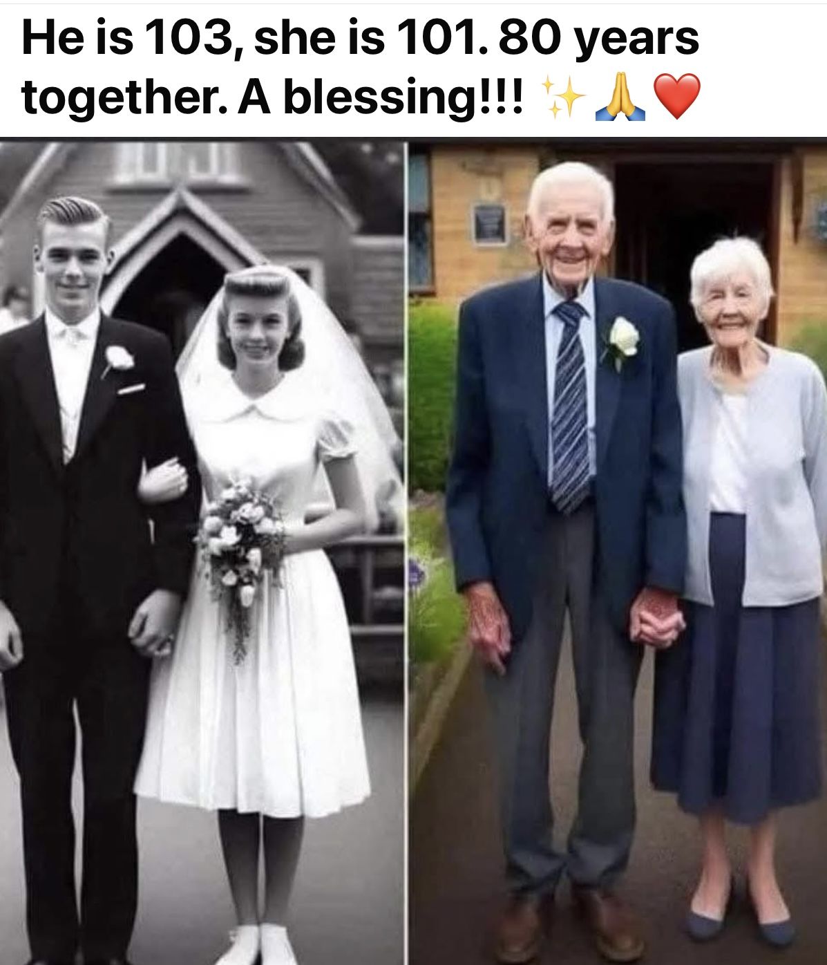 Some photographs feel like living poems, and this one captures a lifetime of devotion in two beautiful frames. On the left, a black-and-white wedding photo shows a young couple glowing with hope, their hands clasped as they begin their journey together. On the right, decades later, the same couple stands in almost the same poseβhe is now 103, she is 101βstill holding hands, still smiling, still side by side after 80 extraordinary years of marriage. πΈβ¨