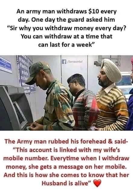 Not all love stories are written in letters or spoken in grand words—some are hidden in the smallest gestures of everyday life. This picture tells one such story: a soldier standing quietly at an ATM, withdrawing just $10 each day. To others, it might seem like a habit or a quirk, but behind it lies a profound act of love.