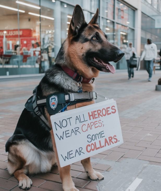 Sometimes the bravest souls don’t fly through the skies or wear masks of glory—they walk on four legs, tails wagging, hearts loyal beyond measure. This powerful image of a German Shepherd sitting proudly with a sign that reads “Not all heroes wear capes; some wear collars” is a reminder of the silent guardians who protect, serve, and love us unconditionally. 🐶✨