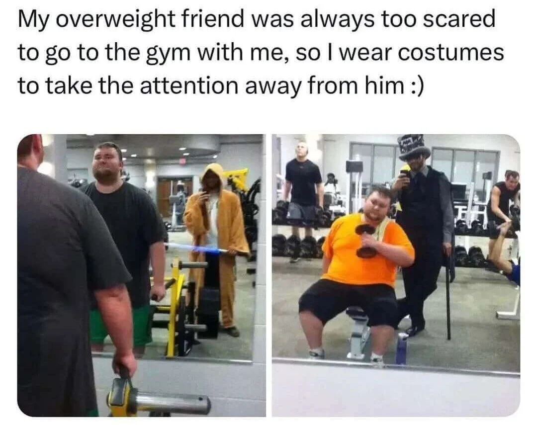 So, what did he do? He put on costumes—silly, bold, outrageous outfits that instantly grabbed everyone’s attention. From a Jedi robe to a magician’s hat, he turned the spotlight on himself so his friend could work out in peace. 🧡✨