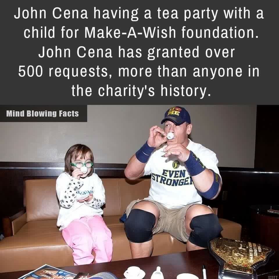 When people think of John Cena, they often picture the powerhouse wrestler, the movie star, or the global celebrity. But behind the spotlight lies a legacy far more powerful—his record-breaking dedication to the Make-A-Wish Foundation. Pictured here, Cena sits cross-legged at a tiny tea party, sipping from a toy cup beside a smiling child. No cameras flashing, no show of strength—just pure, gentle humanity. 🌸☕ What makes this moment extraordinary is not just the laughter in the room, but the fact that John Cena has granted over 500 wishes for children battling life-threatening illnesses—more than anyone in the charity’s history. 🌟